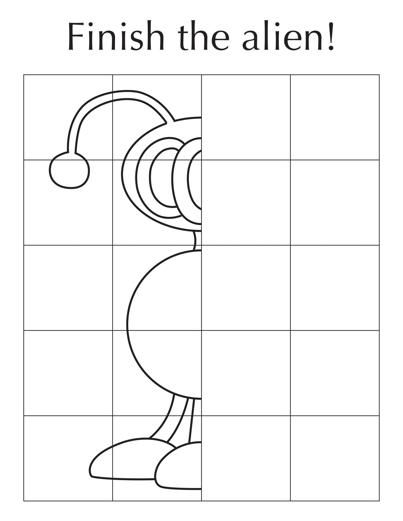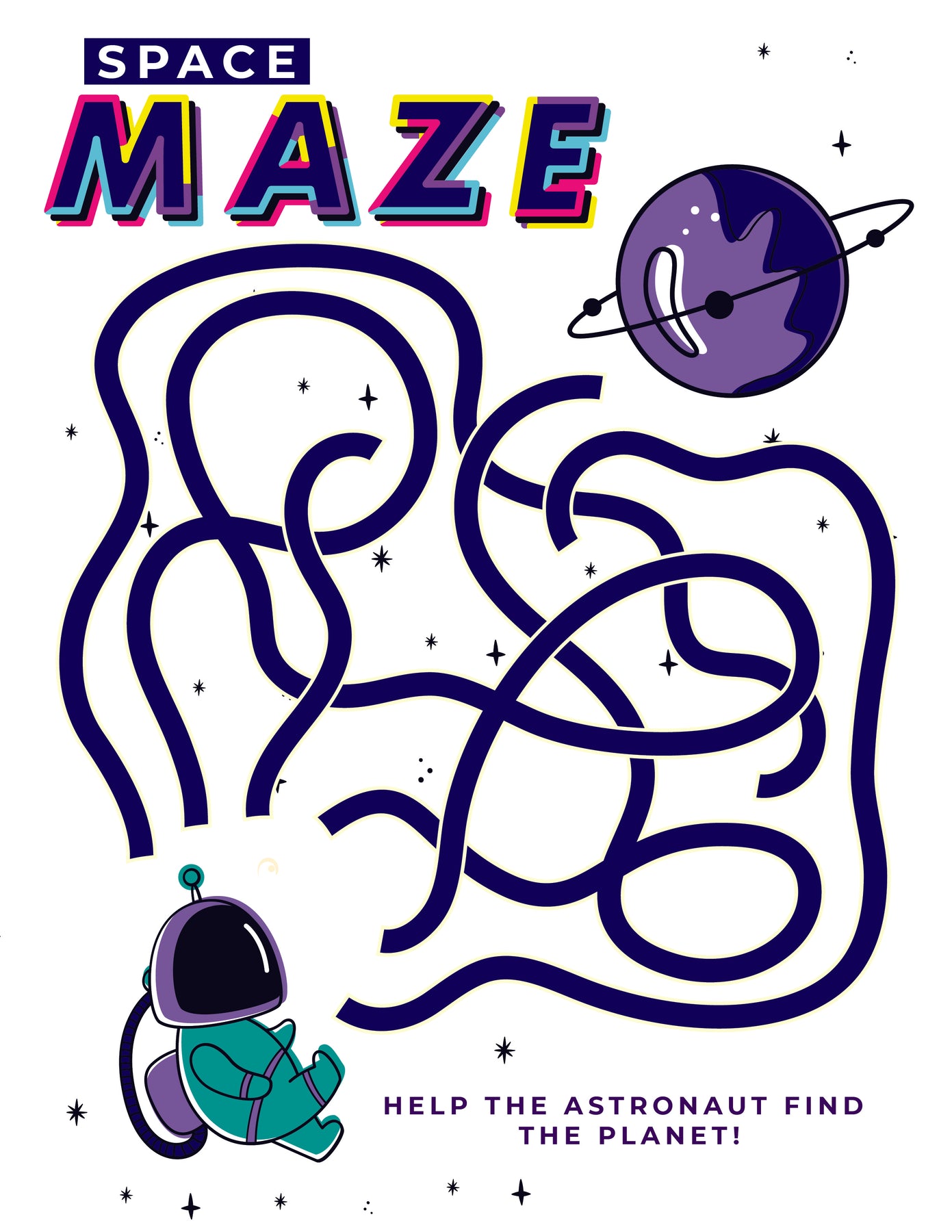 Activities include I-Spy, coloring pages, word search, a maze, draw a planet, draw an alien, and more!